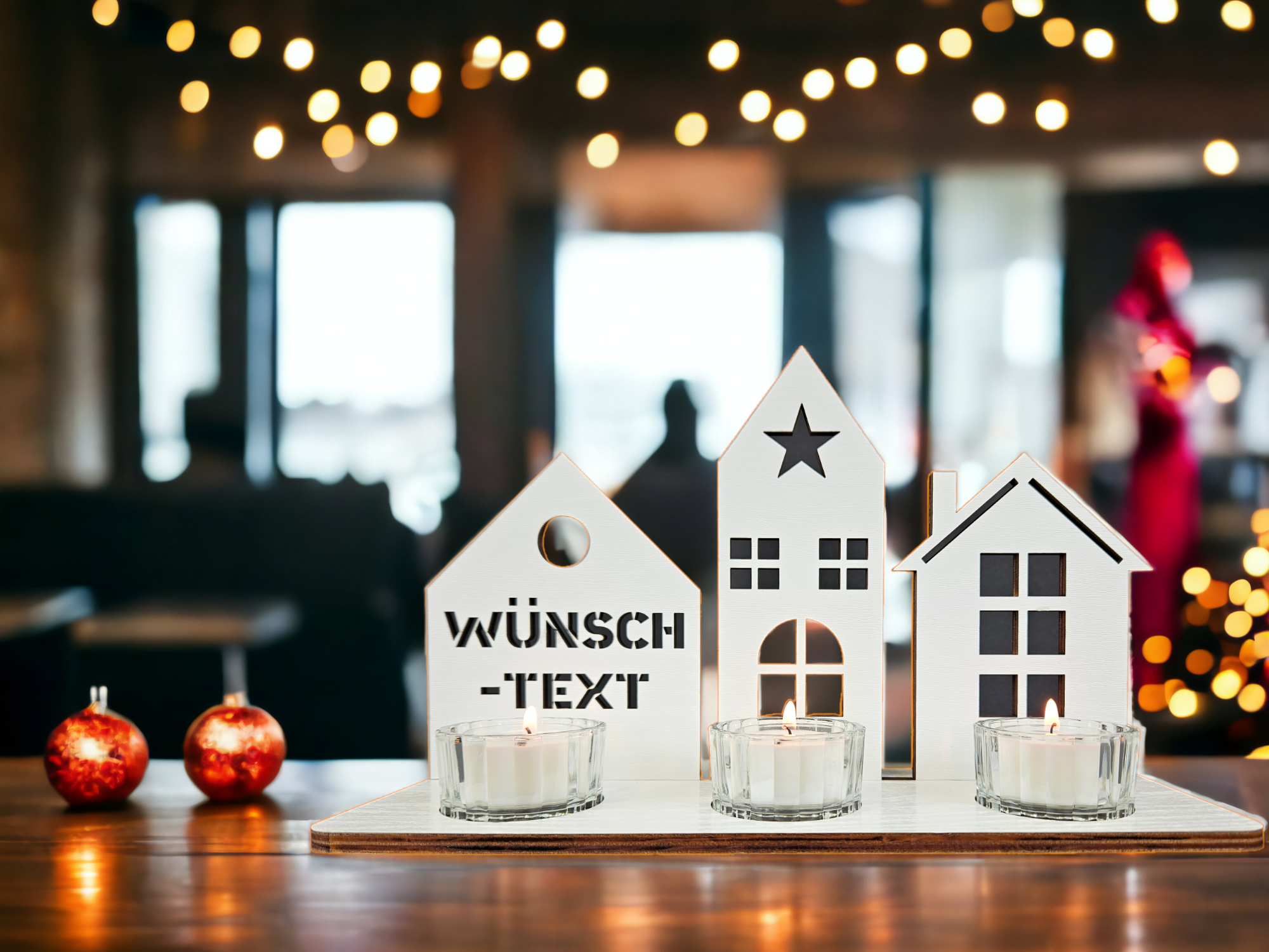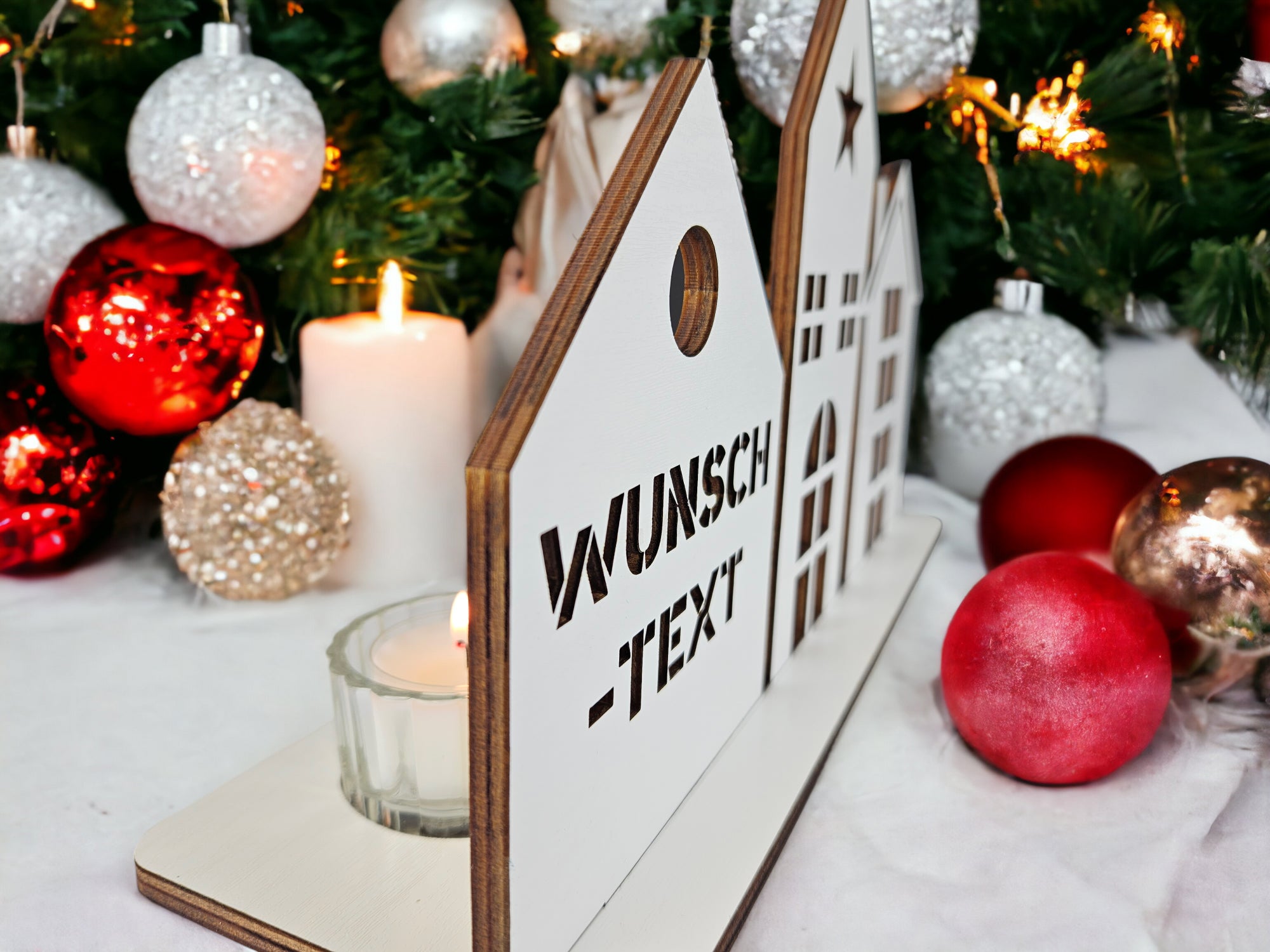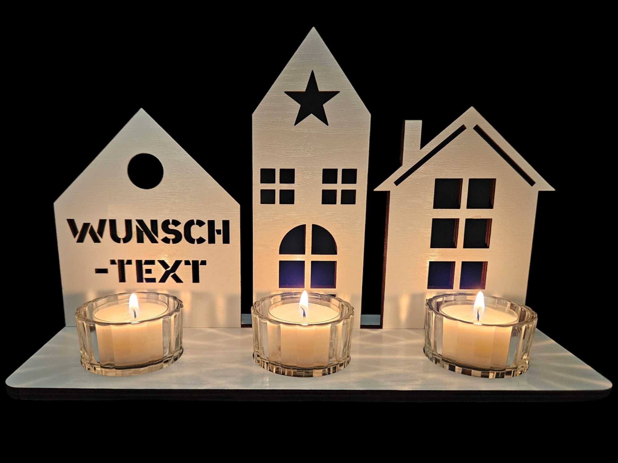Waluna® Lichterstadt 3 Teelichthalter Mini Lichthaus aus Holz personalisiert mit Wunschtext oder Familienname 12 Farben Tischdeko
