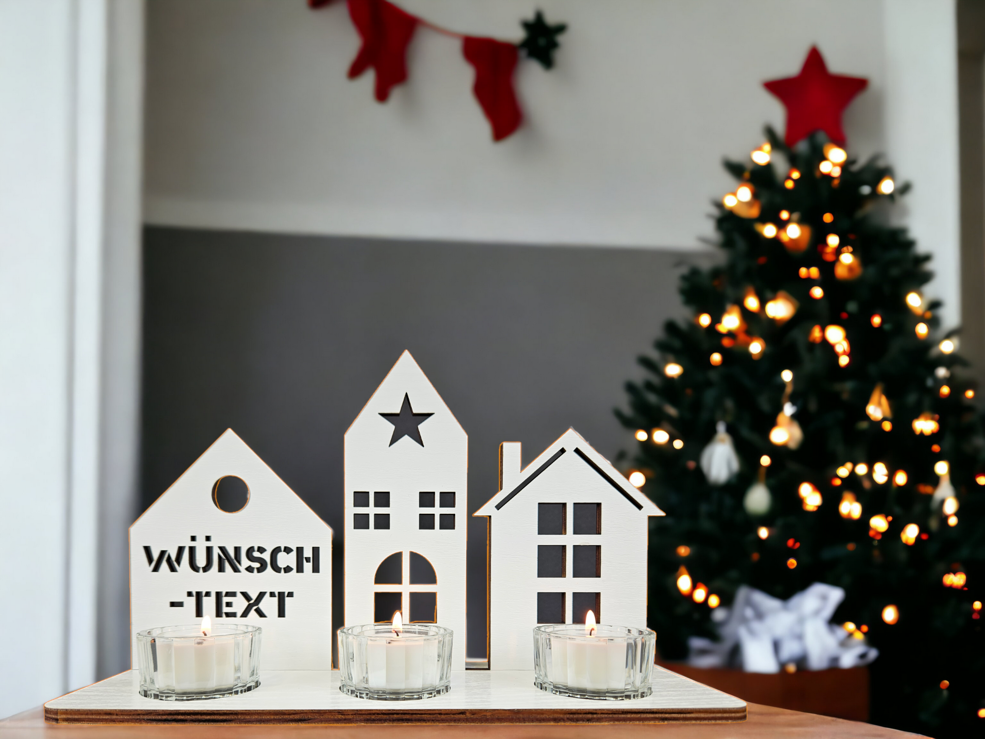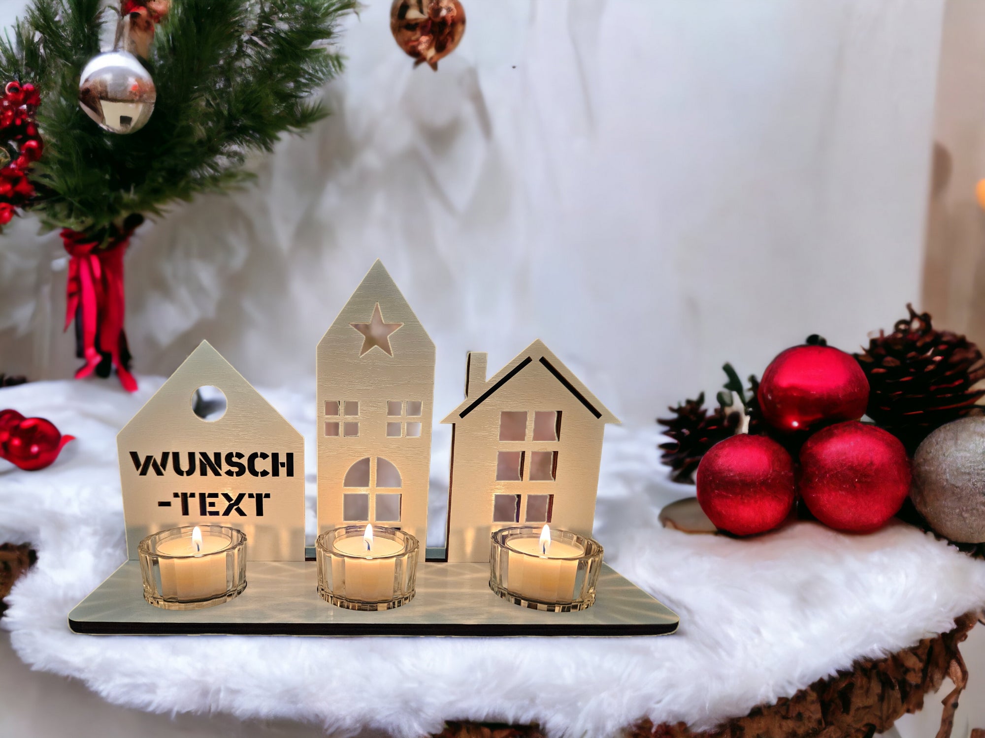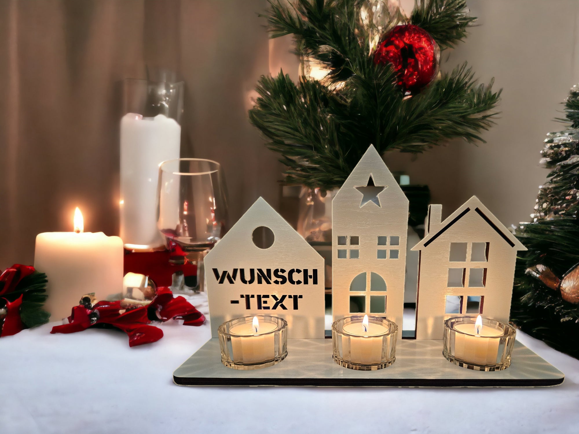 Waluna® Lichterstadt 3 Teelichthalter Mini Lichthaus aus Holz personalisiert mit Wunschtext oder Familienname 12 Farben Tischdeko