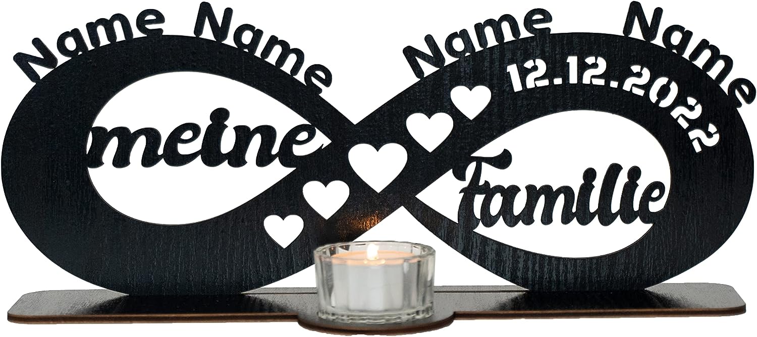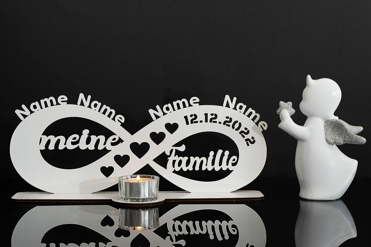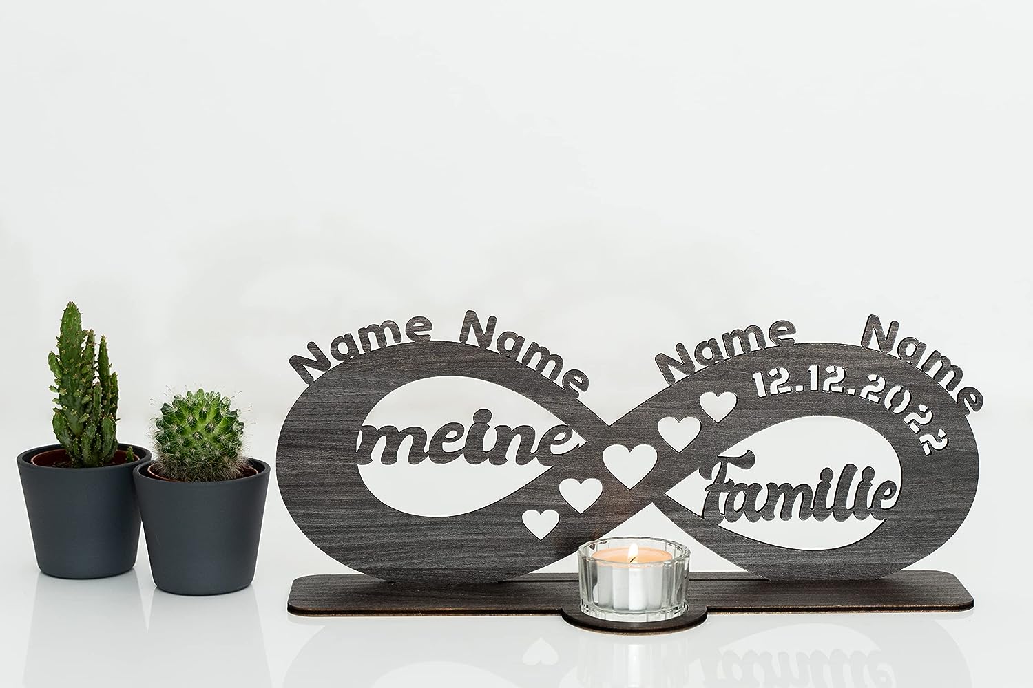 Family Familien Gechenk Teelichthalter Unendlichkeitszeichen personalisiert mit Wunschnamen/Datum Herzen zum Jahrestag Geburtstag
