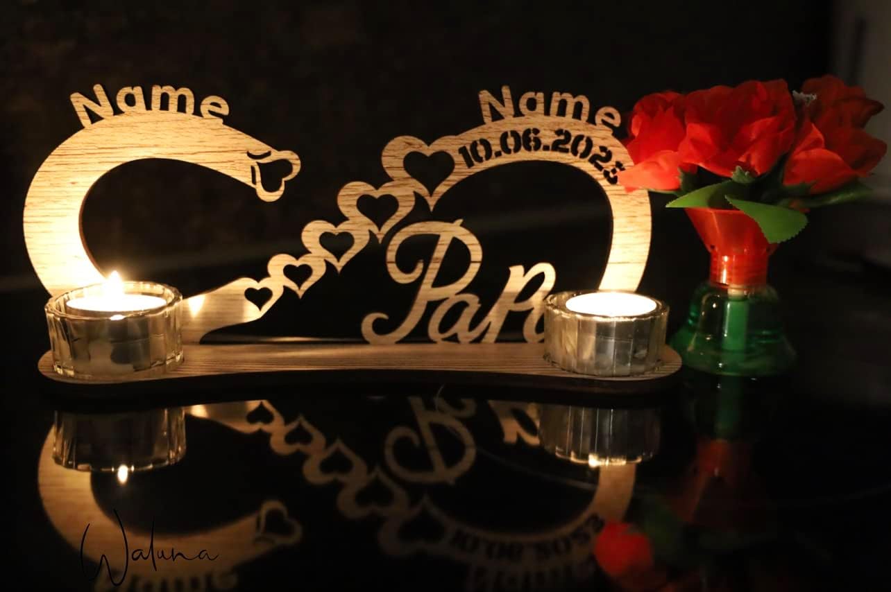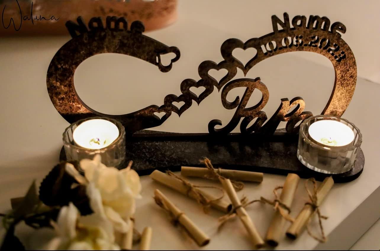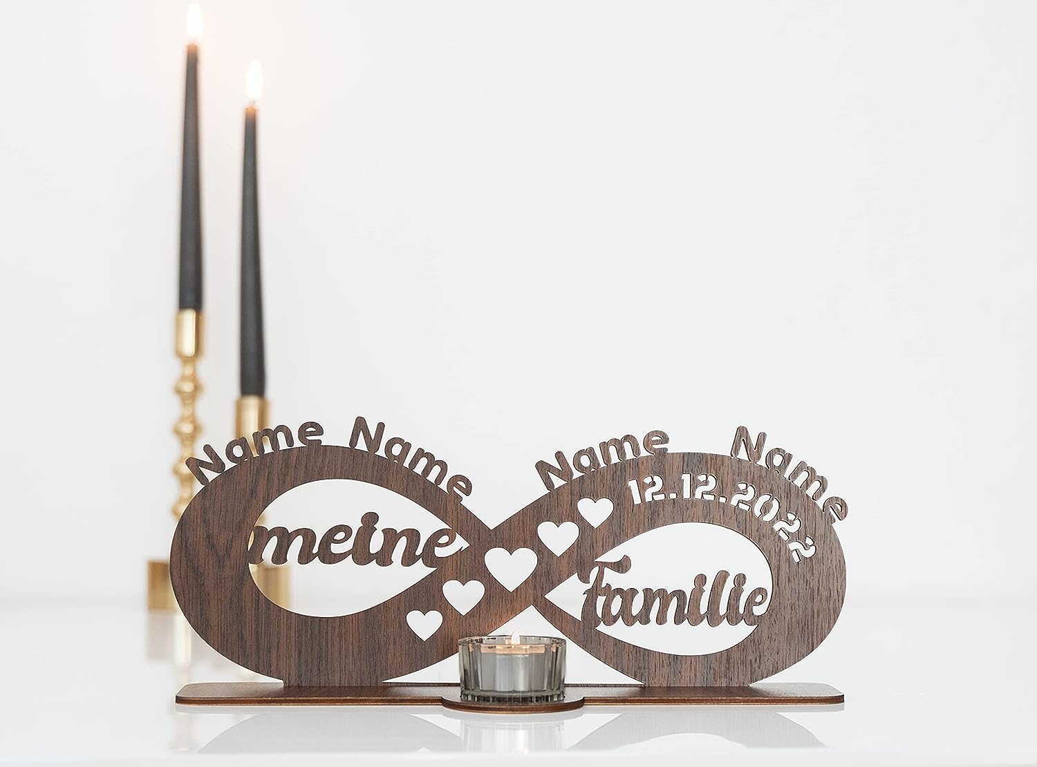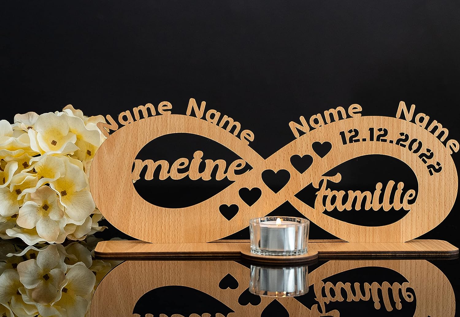 Family Familien Gechenk Teelichthalter Unendlichkeitszeichen personalisiert mit Wunschnamen/Datum Herzen zum Jahrestag Geburtstag